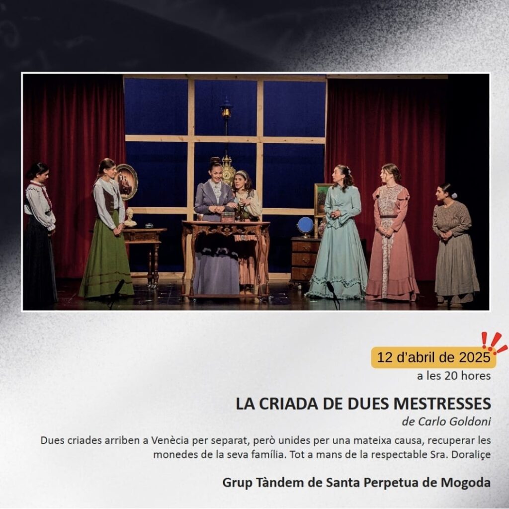 El dissabte 12 d’abril a les 20 h rebrem el Grup Tàndem de Santa Perpètua de Mogoda amb l’obra “La criada de dues mestresses”.
