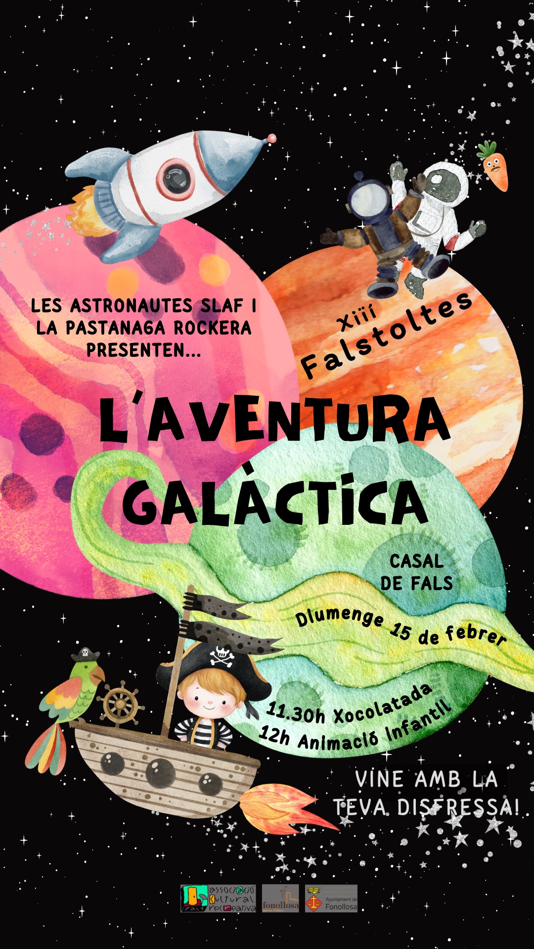 La 13a edició del Falstoltes, l’animació infantil de Carnestoltes de Fals, aquest any se’n va de viatge, però no a un lloc qualsevol, no…se’n va a l’espai! Les Super-Llunàtiques Astronautes de Fals (SLAF) i la Pastanaga Rockera ajudaran al Pirata Espacial en una una aventura galàctica plena de cançons, balls, jocs i molta gresca!